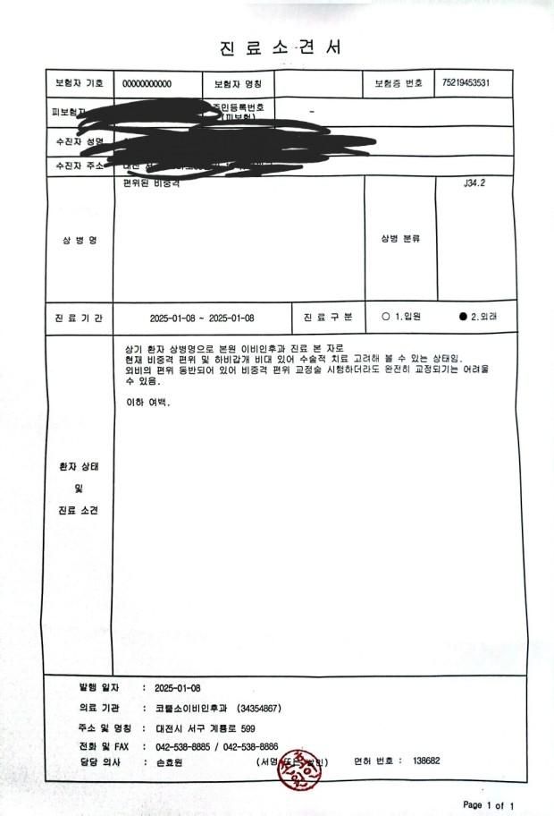제 코 및 귀에 대한 진단서 및 소견서입니다. 귀 관련 서울성모병원 방문하여 귀 확인한 결과 수술적 치료는필요없고 1년단위 동네에 있는 대학 종합 병원 다니면서 고막 및 청력 확인 하면 된다고 답변 받았습니다.