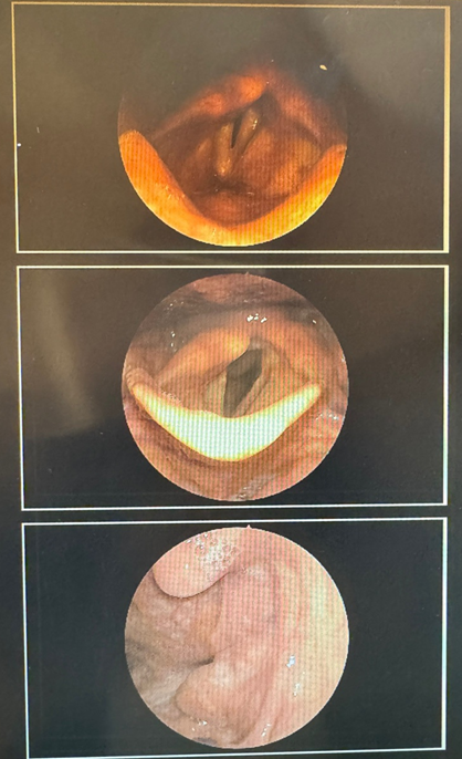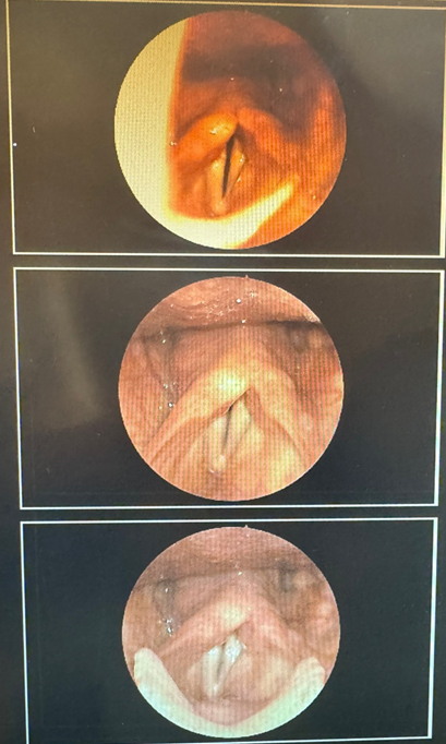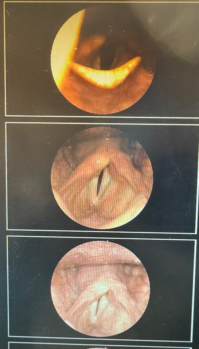 보입니다. 사진만으로는 아직 확진은 어려우며 성대 마비만 관찰되는