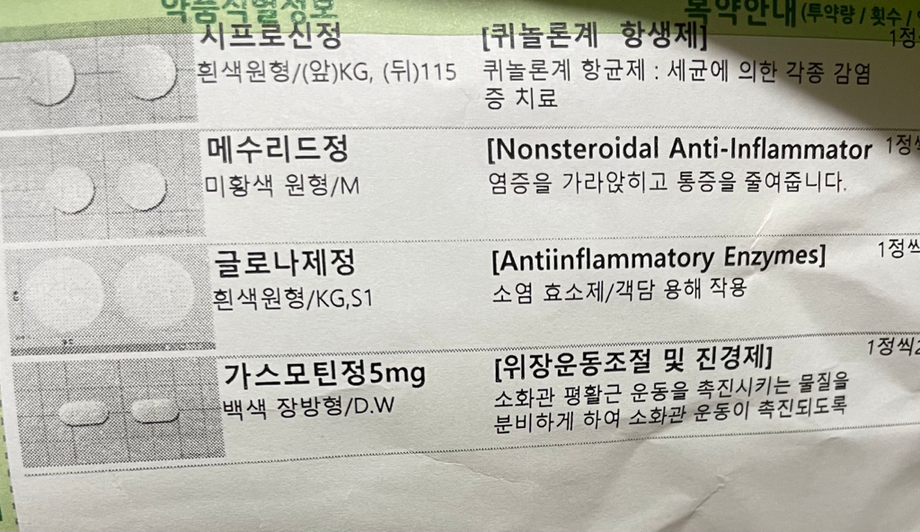위에 처방전에는 항생제/스테로이드/소염제/위보호제 처방되었고, 아래처방전에는 항원충제 처방되어있어 감염성 질환에 사용할 수 있습니다.