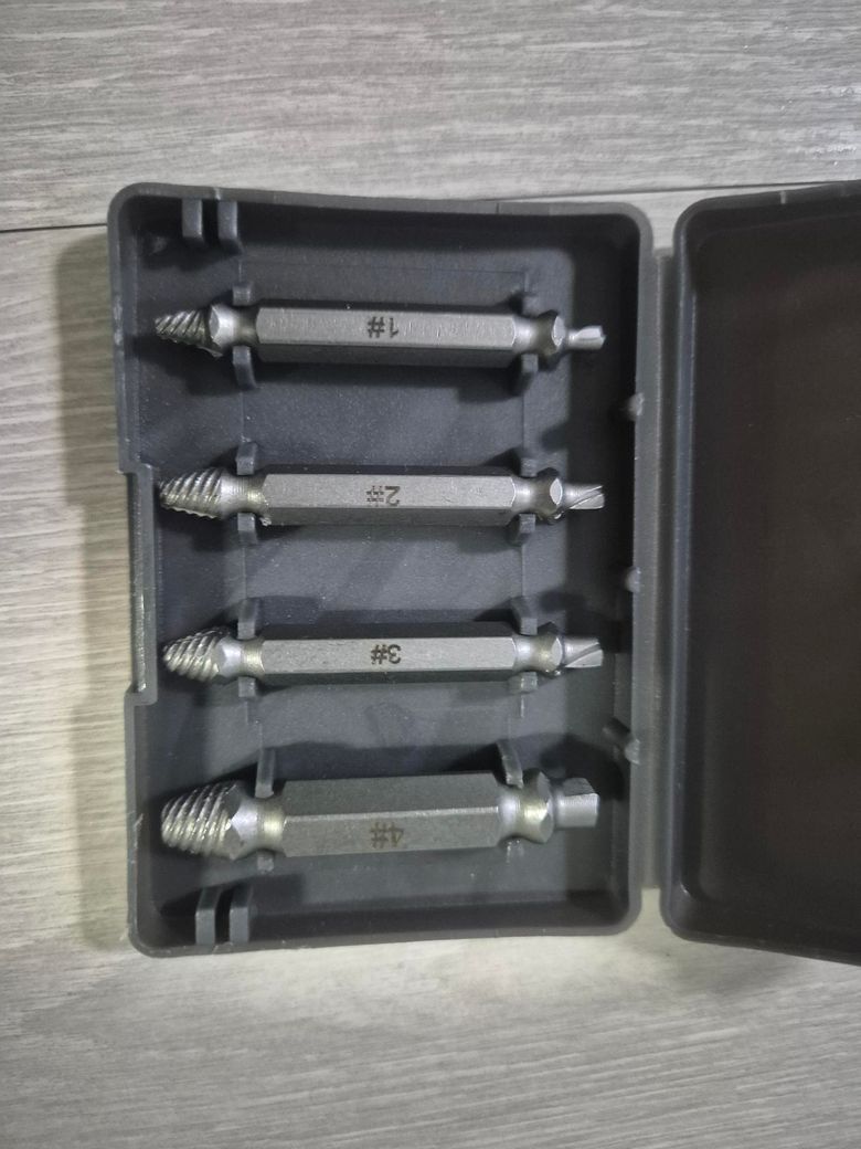 사진 속 비트는 나사제거용 스크루 익스트랙터 비트입니다. 이 비트들은 일반 전동 드라이버나 전동 드릴의 비트 홀더에 꽂아 사용합니다. 녹슬거나 망가진 나사, 머리가 뭉개진 나사를 뽑을때, 이 비트로 나사 구멍에 돌려 꽂아 반대 방향으로 돌리면 나사를 쉽게 제거할 수 있습니다.