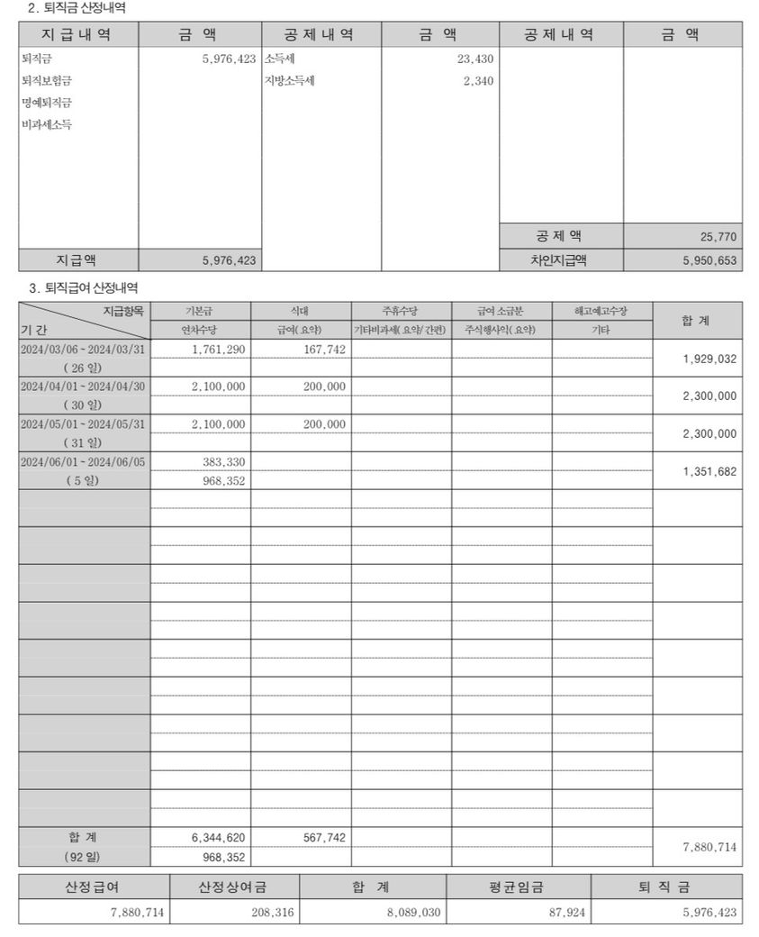 퇴직금이 잔여 금액 등 모든 금액을 포함해서 정산하는거라 다 포함된 금액이라고 하시면서5,950,653원 지급 받았습니다.