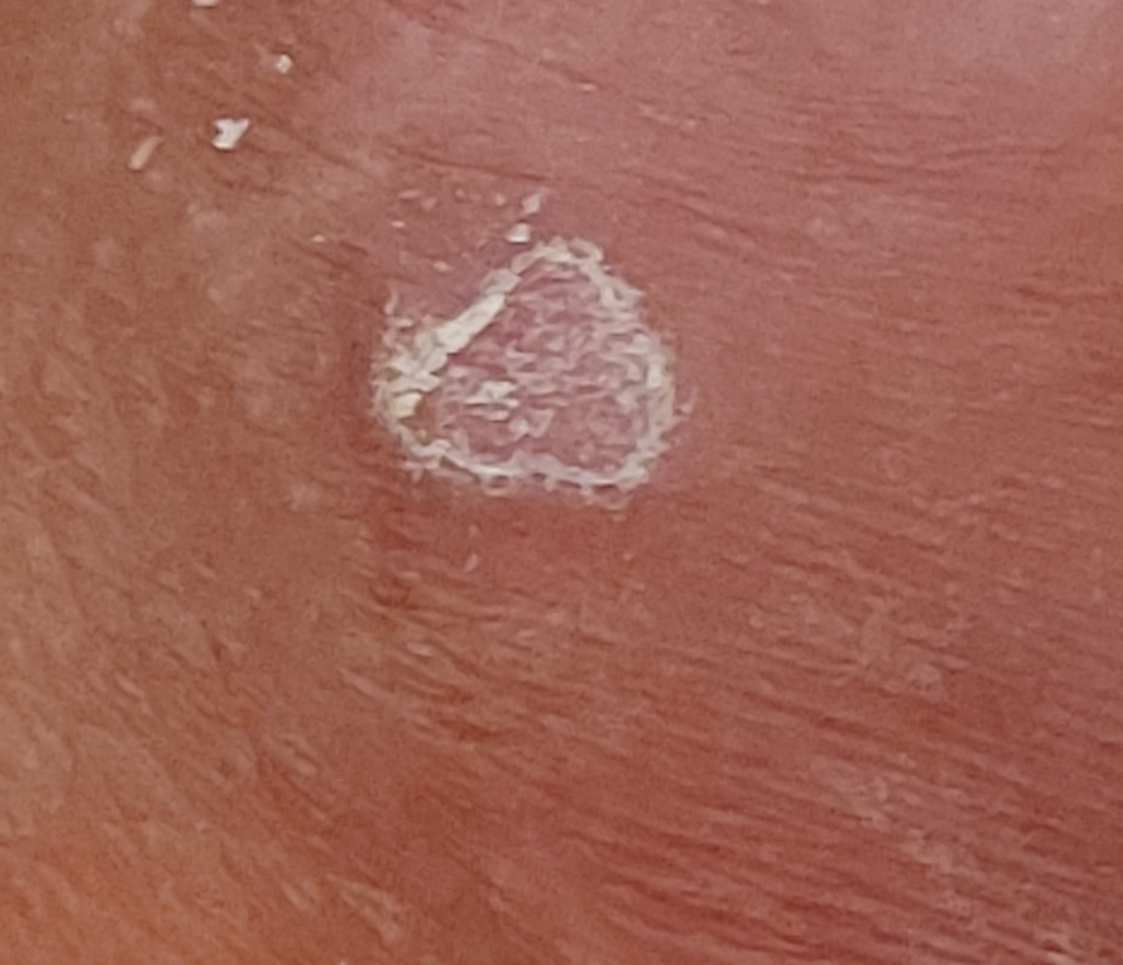 하얗게 보이는 부분은 피부의 각질층으로 생각이 됩니다. 상처가 생긴 후 회복되면서 해당부분에 각질층이 두꺼워졌을 가능성이 있겠습니다. 별다른 이상 소견은 아닐 것으로 생각되며, 통증 등의 다른 증상이 없다면 걱정하지 않으셔도 될 것 같습니다.