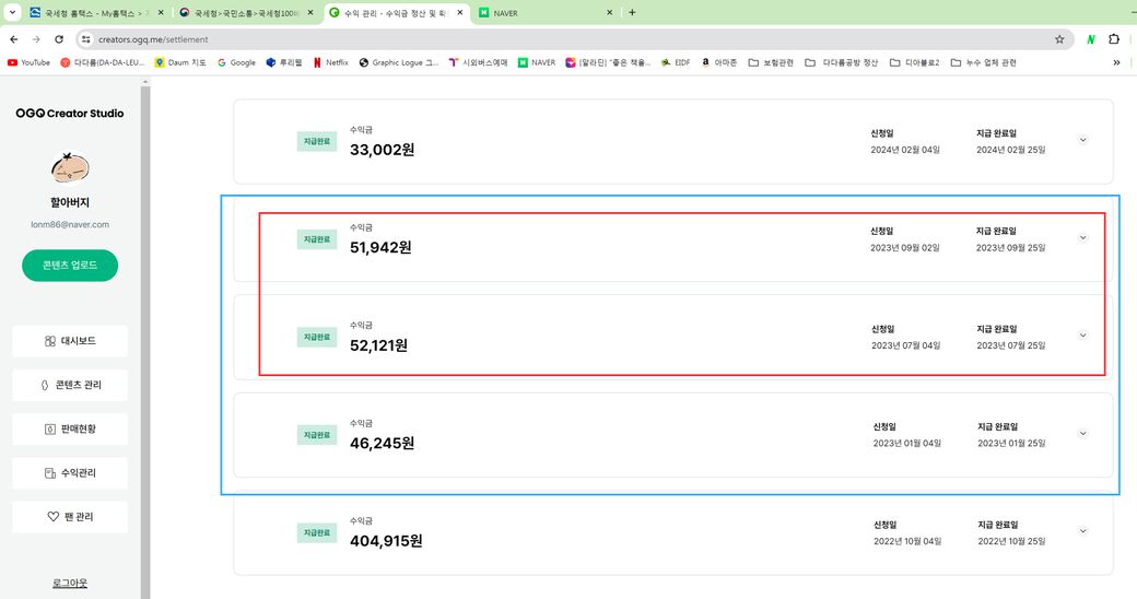 실제로 23년 1월에 정산을 받은 (수익금으로 통장에 이체)