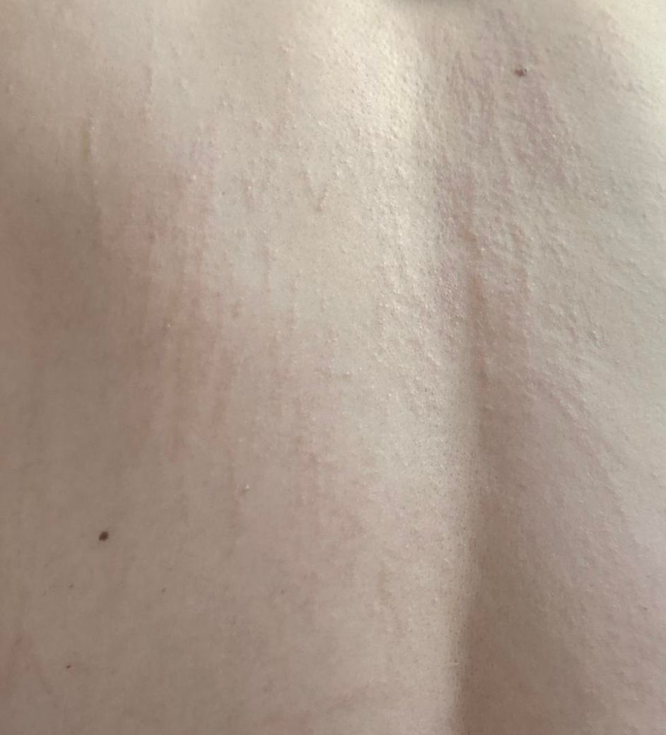 사진상 등 부위에 선상으로 긁힌 듯한 팽진이 보이며, 형태로 보아 일반적인 음식 알레르기보다는 피부묘기증(dermographism) 양상의 물리적 두드러기 가능성이 높습니다. 피부묘기증은 마찰이나 압박, 체온 상승에 의해 비만세포가 자극되면서 히스타민이 분비되어 선 모양으로 부풀어 오르는 것이 특징입니다. 특히 더위를 많이 타고 땀이 많으며, 밤 시간대 체온이 상승한 상황이라면 콜린성 두드러기(cholinergic urticaria) 성향이 겹쳤을 가능성도 있습니다.