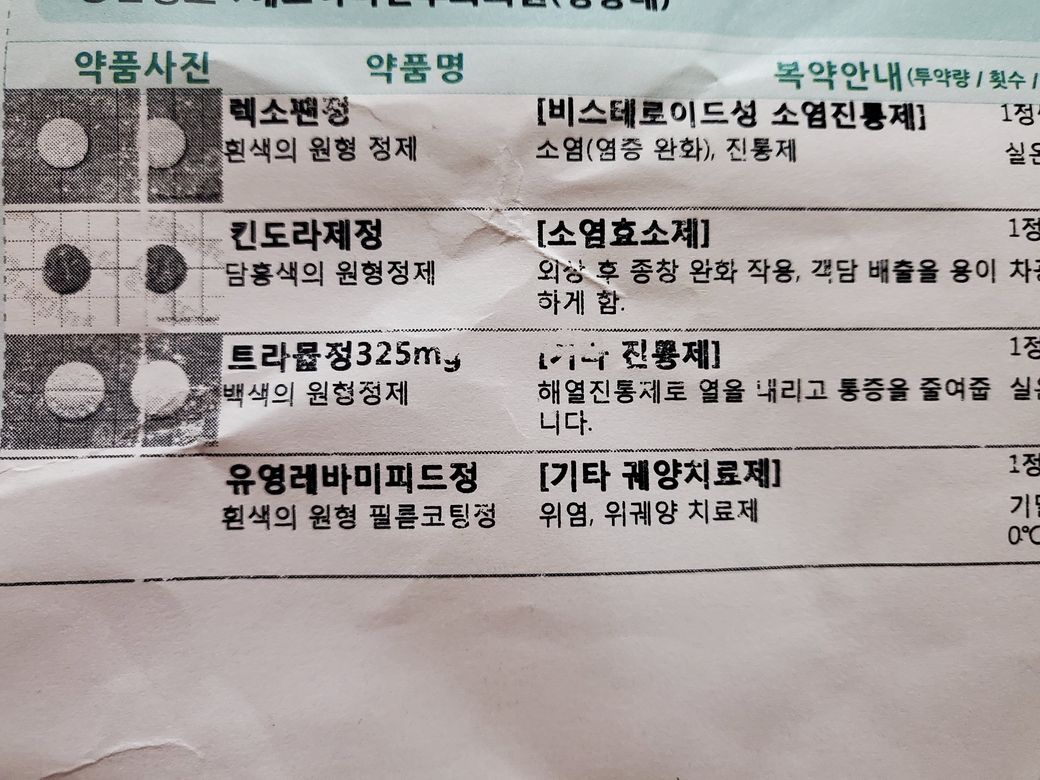 1. 렉소펜정 - 소염진통제, 킨도라제정 - 소염제, 트라몰정 - 해열진통제(타이레놀 같은 성분), 유영레바미피드정 - 위장약