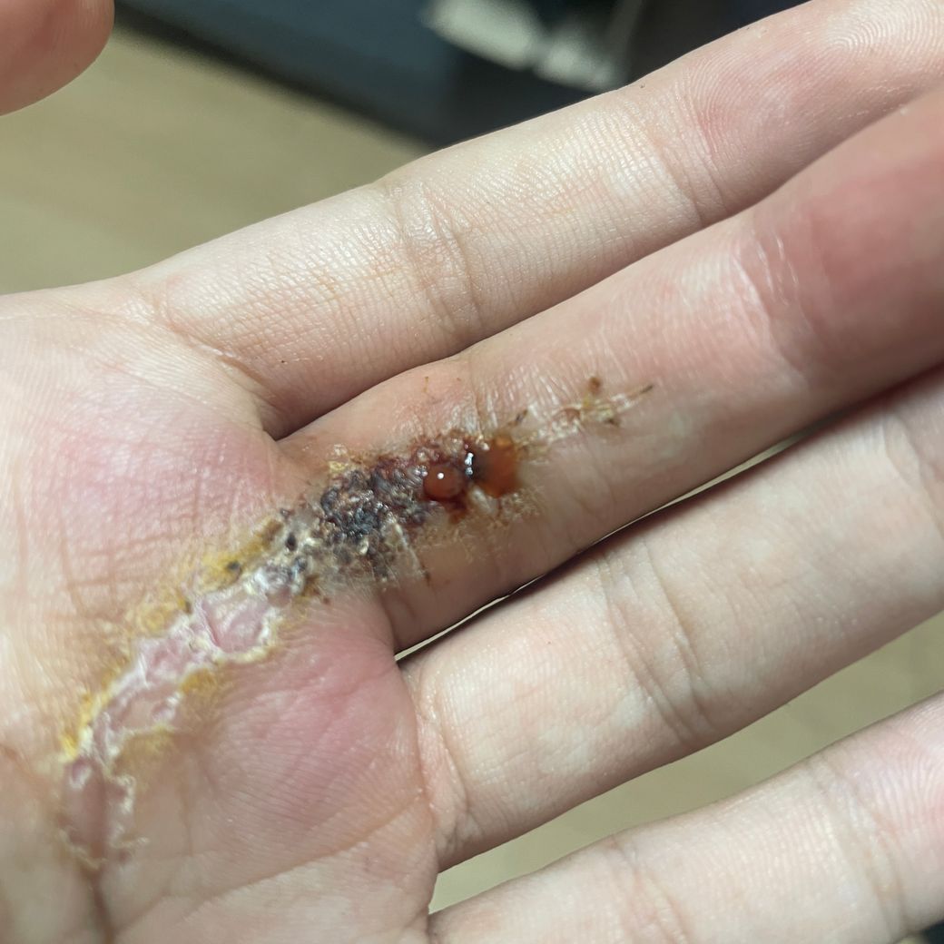 유착박리술 후 3주째인데 손가락을 움직이면 고름인지 진물인지 모를것이 여전히 나옵니다.