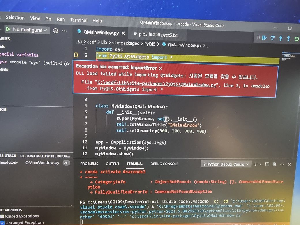 Visual stuido code pyqt5 에러 질문이요. 어떻게 해결하나요???