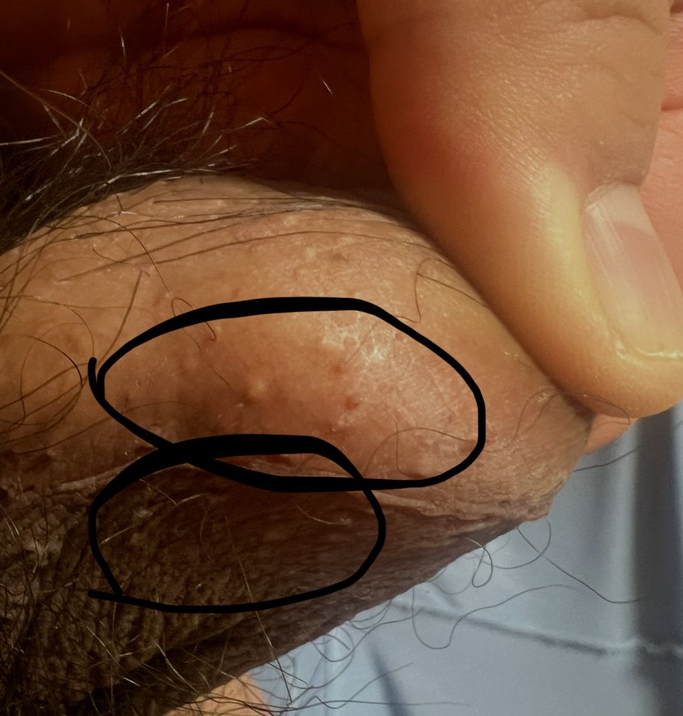 1. 피지선 증식 또는 Fordyce spot: 귀두나 포피에 흔하고 비성병성입니다. 흰색·노란색 점처럼 보이며 통증은 거의 없습니다.