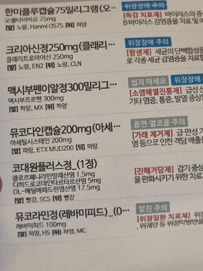 사진상 처방은 오셀타미비르(항바이러스제), 클래리트로마이신(항생제), 덱시부프로펜 300mg(소염해열진통제), 아세틸시스테인, 복합감기약, 레바미피드로 보입니다. 이 중 맥시부펜이알정 300mg이 덱시부프로펜으로 해열 효과가 있는 약입니다.