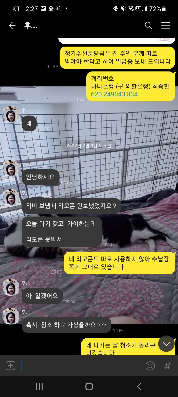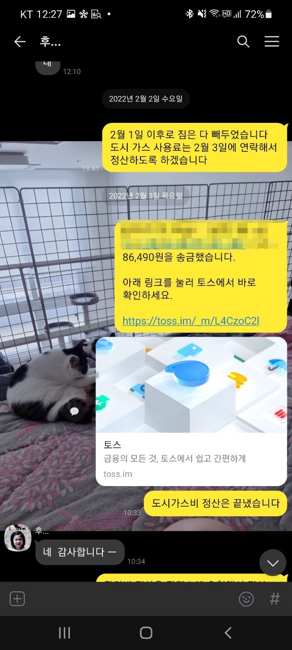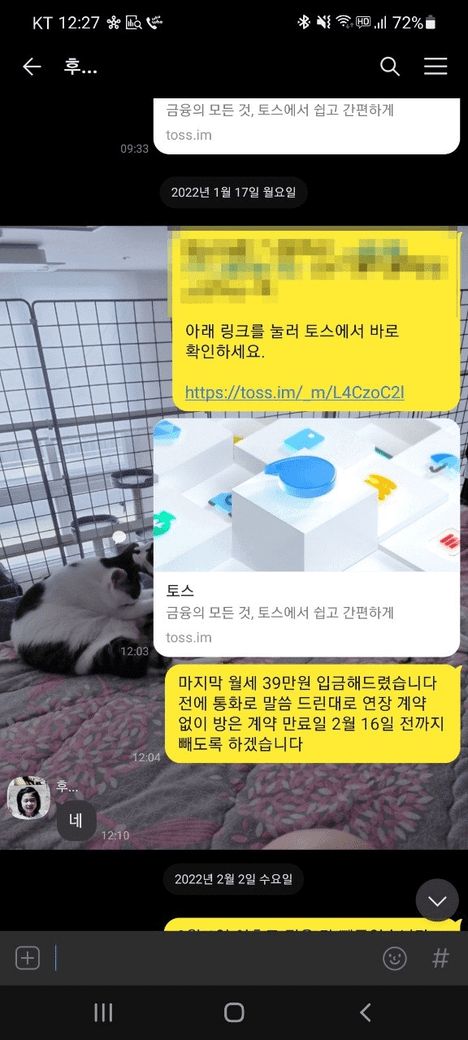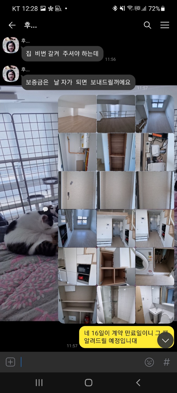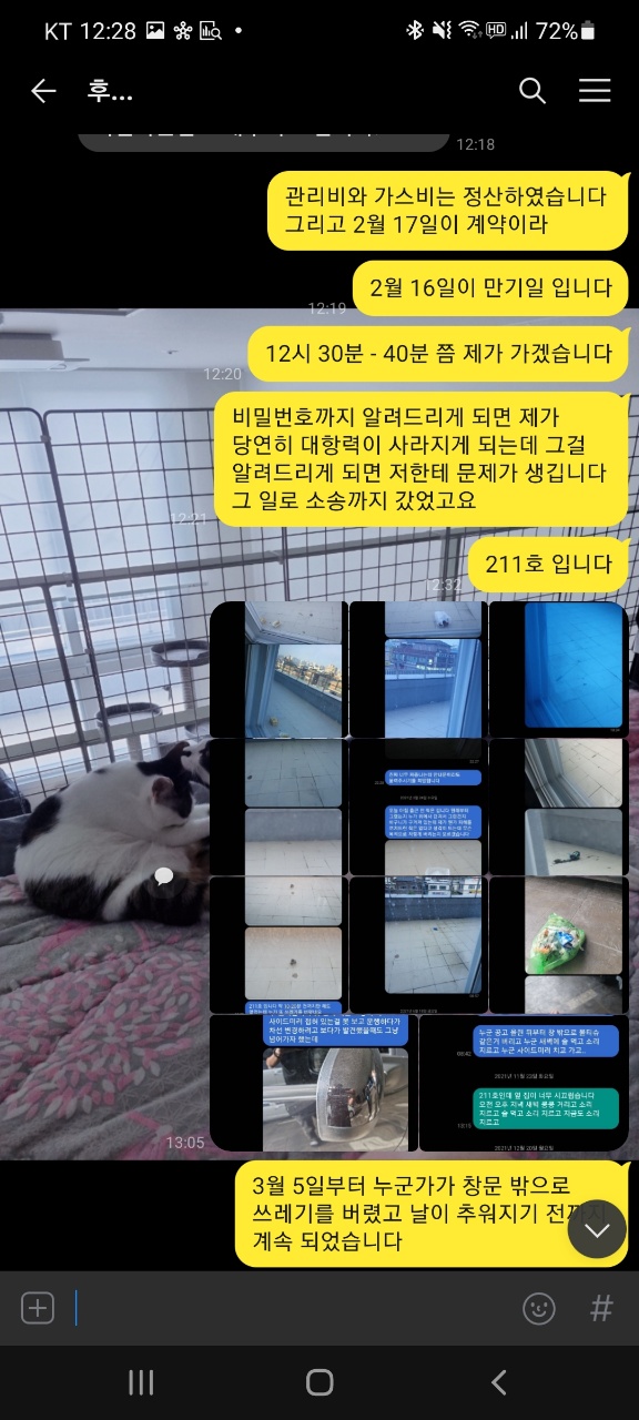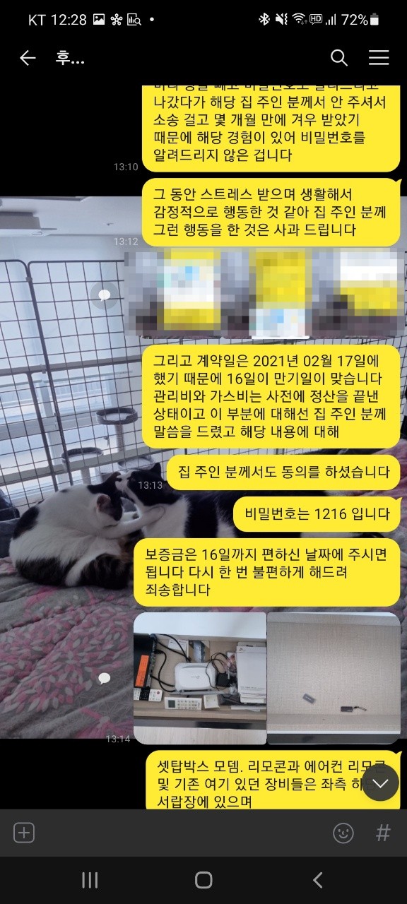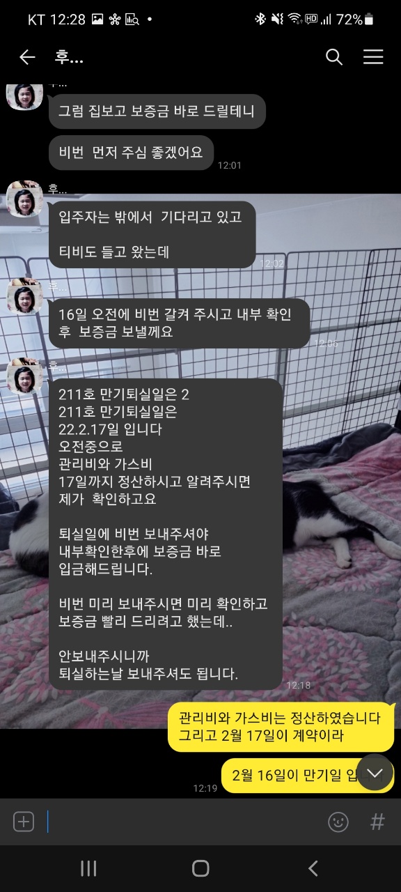 또한, 2022년 02월 01일에 모든 짐을 빼고, 2022년 02월 03일에 관리비와 가스비 정산을 끝낸 후 해당 내용을 집 주인 분께 말씀드렸고 '네' 라는 답변을 받았습니다. 그런데 갑작스럽게 현재 새 계약자와 함께 집 앞에 있다며 비밀번호를 요구했고 그 말에 보증금을 입금해주셨냐는 물음에 입금하지 않았다고 하여 보증금을 입금해주면 알려준다고 한 후부터 일이 생겼습니다.