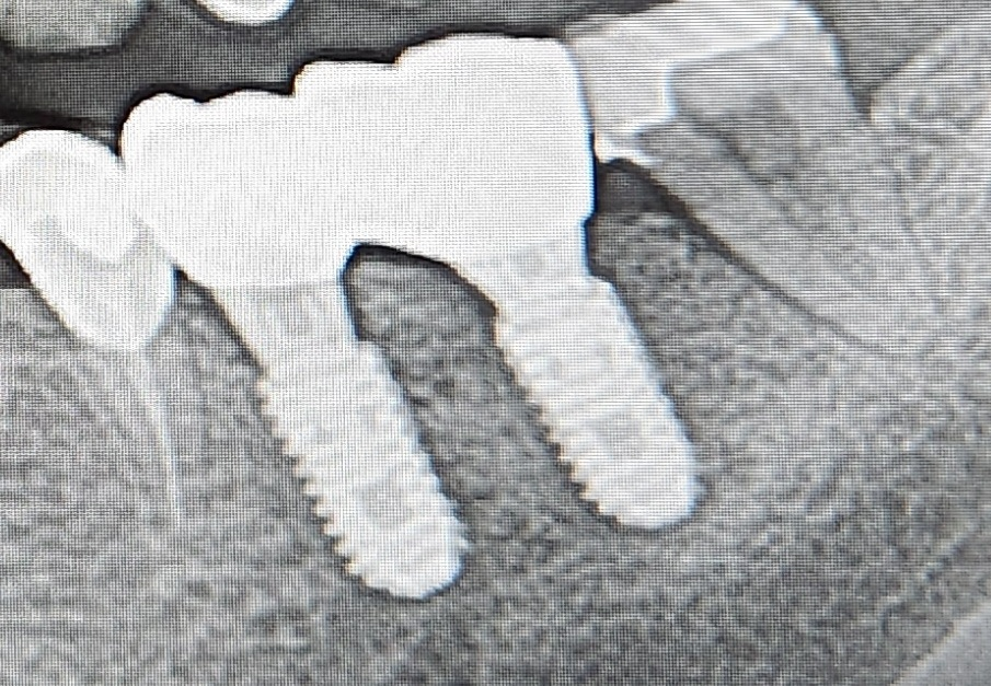 일반적으로 임플란트는 묶어서 보철물을 만듭니다. 사진상으로 보면 임플란트 보다 임플란트 뒤쪽치아가 안좋아 보이네요. 가셔서 검진을 받아보세요.