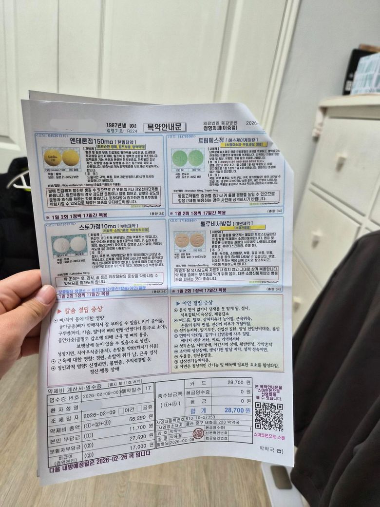 디스크도 가능성은 있지만, 지금 형태는 말초신경 문제 쪽이 더 가능성이 높습니다. 지금 처방받은 약 사진을 보면 원인 치료라기보다는 통증/염증/순환 보조 위주의 처방입니다.