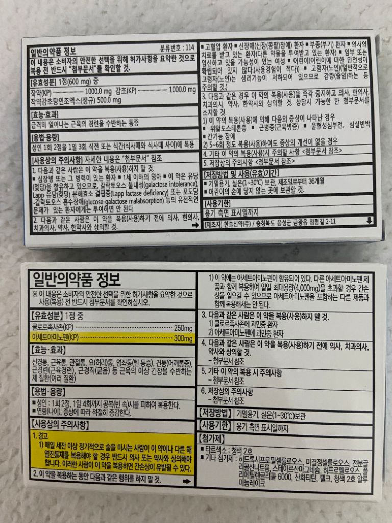 작약감초탕과 근육이완제를 1알씩 함께 복용하셔도 됩니다. 증상이 호전되지 않을 경우 다른 성분의 진통제(이부프로펜, 덱시부프로펜, 나프록센) 성분의 진통제를 추가로 복용하셔도 됩니다.