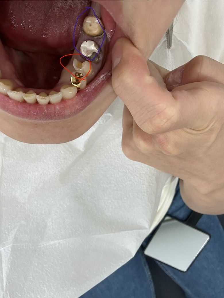 안녕하세요. 파란색으로 동그라미한 어금니 두개는 금 크라운을 씌우기로 했고, 기전 크라운을 벗기는 과장에사 앞에 빨간 동그라미로 칠한 작은 어금니 금인레이(19년도 치료)가 탈락되었습니다. 금인레이와 이맥스인레이 중에서 고민중입니다.