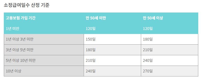 따라서 질의의 경우 고용보험 가입기간이 1년 미만이고 50세 이상이므로 실업급여 수급일수는 120일이 될 것으로 보입니다.
