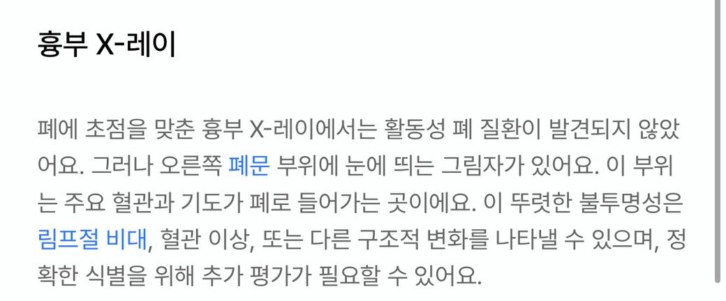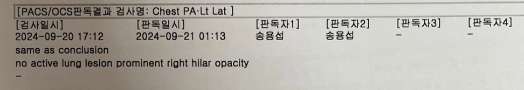안녕하세요. 폐동맥고혈압과 심장병 활로 4징 환자입니다. 지난 입원때에 흉부 엑스레이를 촬영하고 난 후, 질병이 악화되어 서울에 대학 병원으로 전원하게 되면서 차트를 뽑았는데요. 두 번이나 촬영한 흉부 엑스레이 판독 결과가 올해 6월 즈음에 한 건강검진 결과와 같이 오른쪽 폐문에 그림자가 있다는 소견이 적혀 있더라고요.