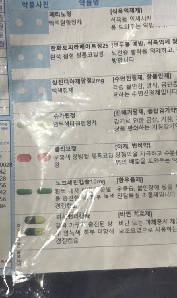 현재 문의주신 약 중에 페티노정이 식욕을 억제하는 약으로 교감신경계를 자극하여 수면에 방해가 될 수 있습니다. 처음에는 강도를 약하게 복용을 하면서 적응하는 것이 몸에 무리가 가지 않습니다