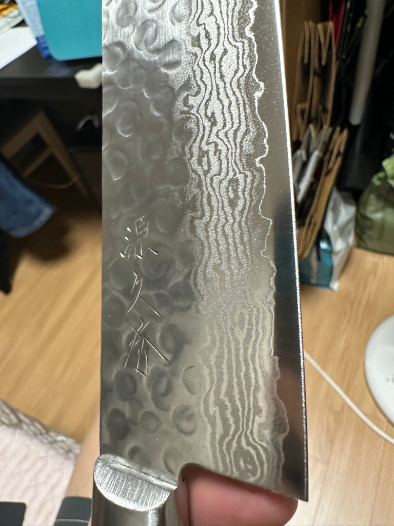 무늬가 저렇게 나오는 것은 강한 철과 연한 철을 여러 겹 겹치고 겹쳐진 철을 망치로 두드려 또다시 여러 번 접어서 만든 것입니다. 이런 종류의 칼을 다마스커스칼이라고 하며 우리나라에서도 대전의 한 대장간에서 만들고 있습니다. 두드려서 만들기 때문에 탄소강이 쓰입니다.