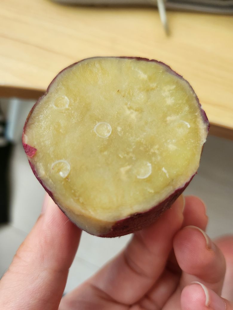 정상: 속이 단단하고, 색깔이 균일하며 특유의 고구마 향이 납니다.