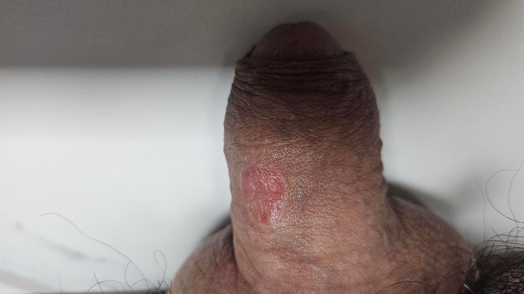 병변 특징을 정리하면 귀두 하부 몸통에 단일 병변, 경계가 비교적 명확한 홍반성 판 형태이고 표면이 약간 벗겨진 듯한 미란 양상입니다. 다발성 수포, 궤양, 딱지 소견은 뚜렷하지 않습니다. 3주 이상 지속되며 점차 커졌다는 점도 중요합니다.