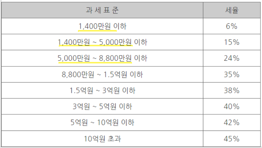 과세표준에 따른 세율은 아래와 같습니다.(2023년 소득발생분 부터 적용되는 세율)