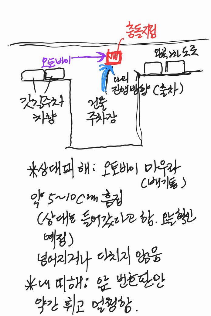 제 의견은, 주창에서 나올 때 그림과 같이 갓길에 주차된차량들이 있어서, 아마도 오토바이는 저를 피하기 위해 중앙선을 넘었을 겁니다. 제가 차선 하나 중간 이상을 이미 진입한 상태였습니다. 제 차 번호판은 살짝 휜것 말고는 멀쩡합니다. 정확한 판단을 위해 그림과 사진 첨부합니다.