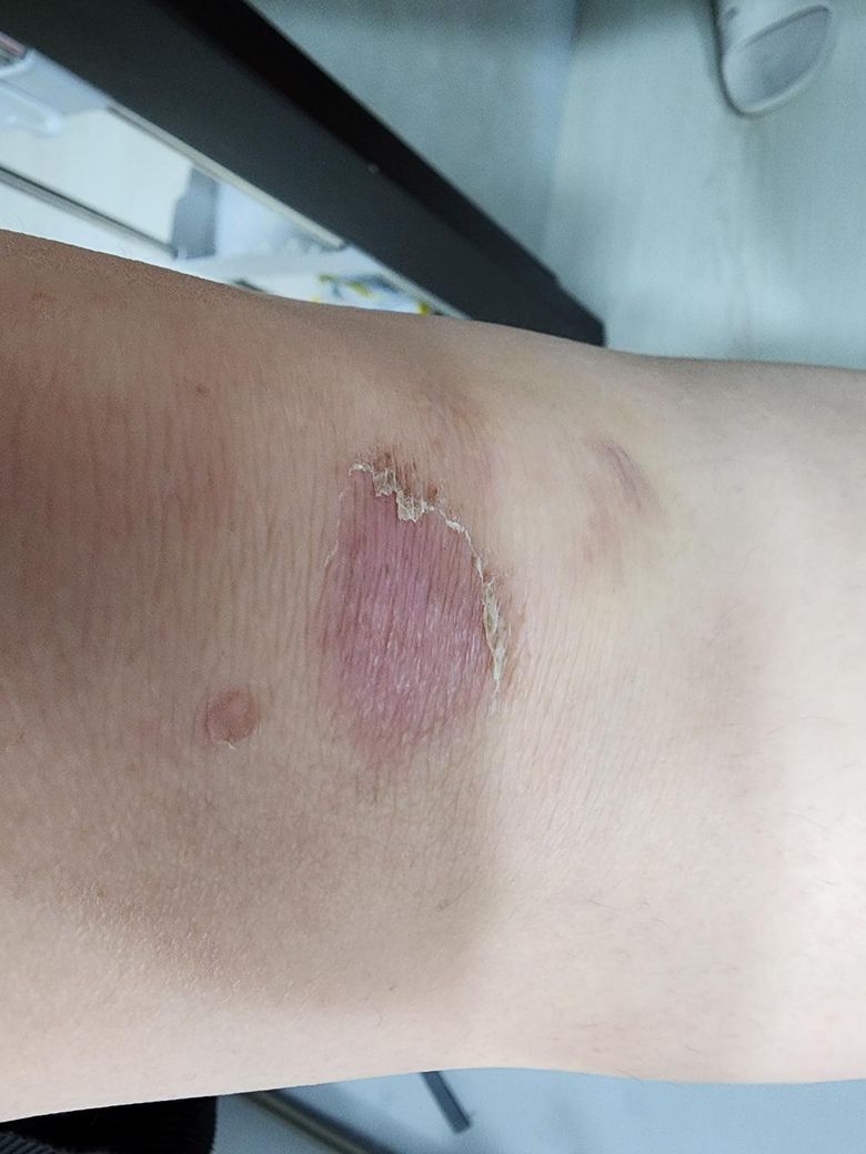 무릎 사진입니다. 넘어진지 2주일 째입니다. 그동안 마데카솔+밴드 또는 습윤밴드로 관리해왔습니다. 이제 진물은 안 나는데 붉은 피부가 되었네요... 상처 흉터 안 생기려면 어떻게 관리해야할까요?