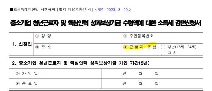 근로자유형에 [ ] 청년 15세~34세, [ ]그외 중 체크를 해야하는데