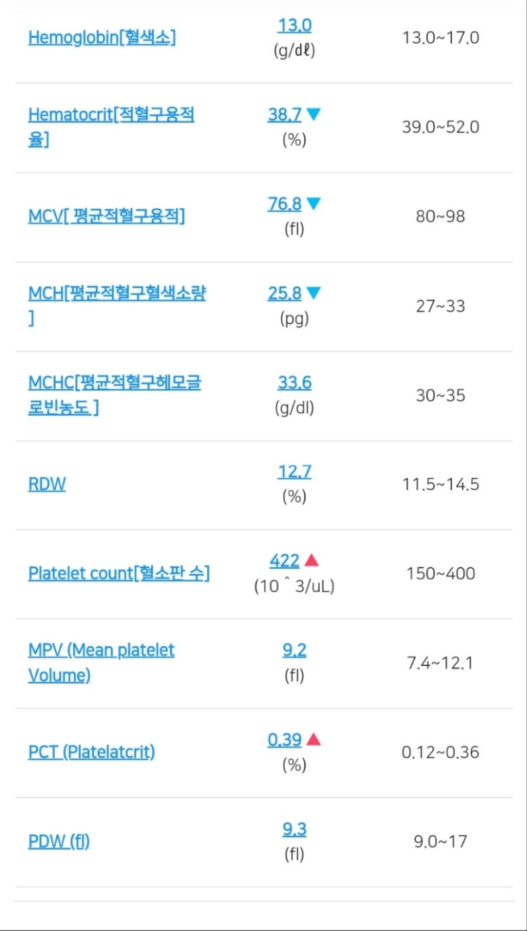 대부분 정상 수치이고 혈소판 수만 정상보다 약간 높은 것 같습니다. 혈소판 수가 약간 높은 것은 건강에 큰 문제가 되지는 않습니다. 정상보다 낮다고 나온 결과들도 마찬가지입니다. 크게 의미를 두지 않아도 되는 검사들이라서 주치의도 설명을 안 해주셨을 거에요.