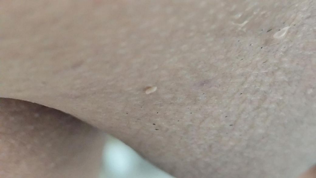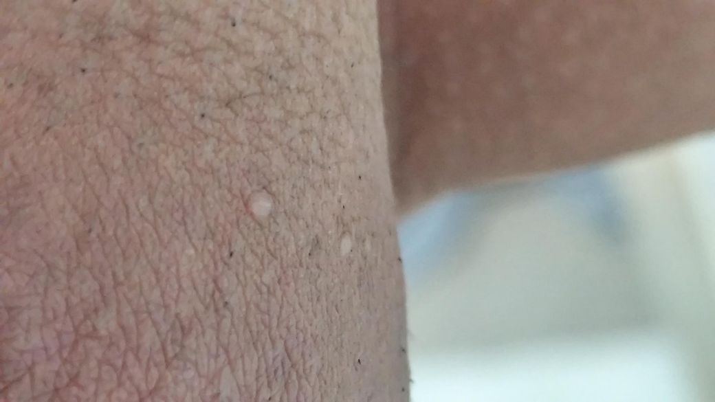 크기가 매우 작고, 피부색 또는 연한 살색, 표면이 비교적 매끈하고, 여러 개가 갑자기 군집해 번지는 양상은 아님