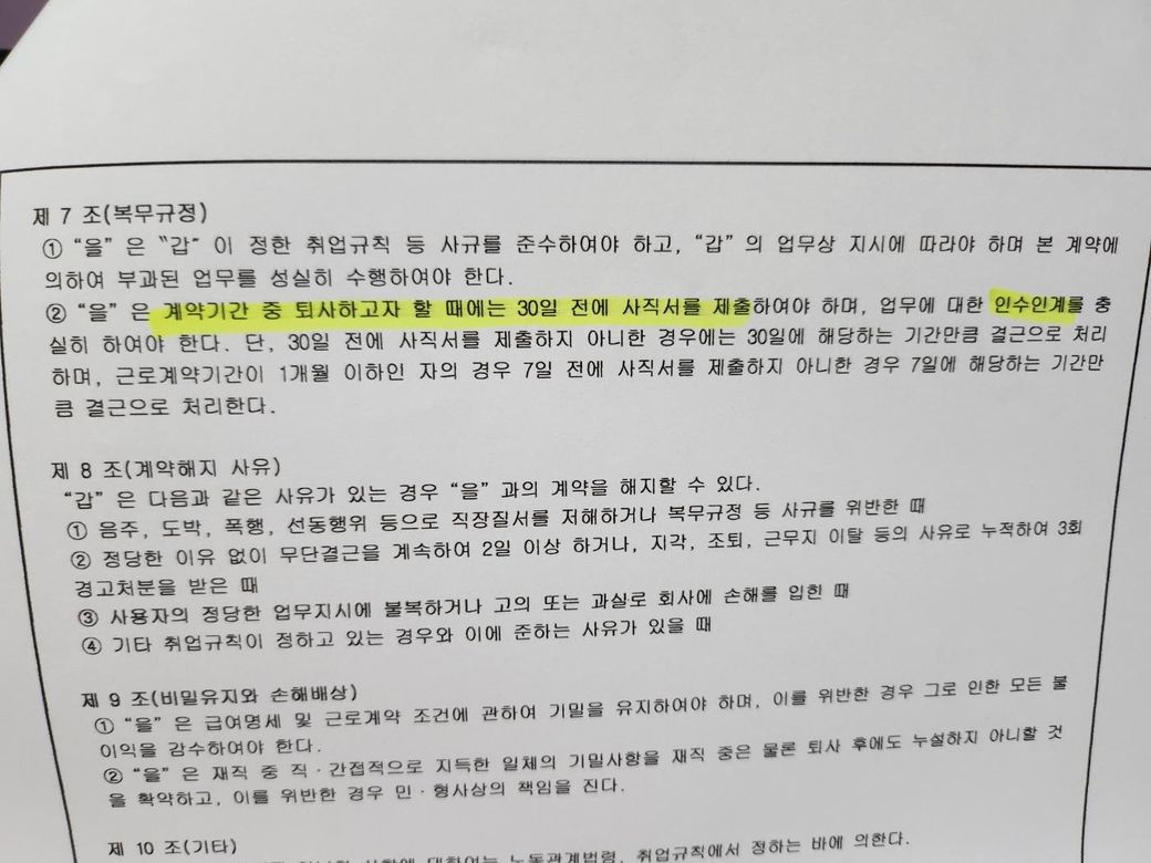 사직서를 제출했는데도 받아주시지 않으면 제가 아무리 퇴사 의견을 밝혀도 그만두지 못하는건가요? 저는 6월에서 7월까지 일을 해야하는건가요? 첨부된 사진은 제가 이곳에서 일을 하게 되며 쓴 계약서 사진입니다.
