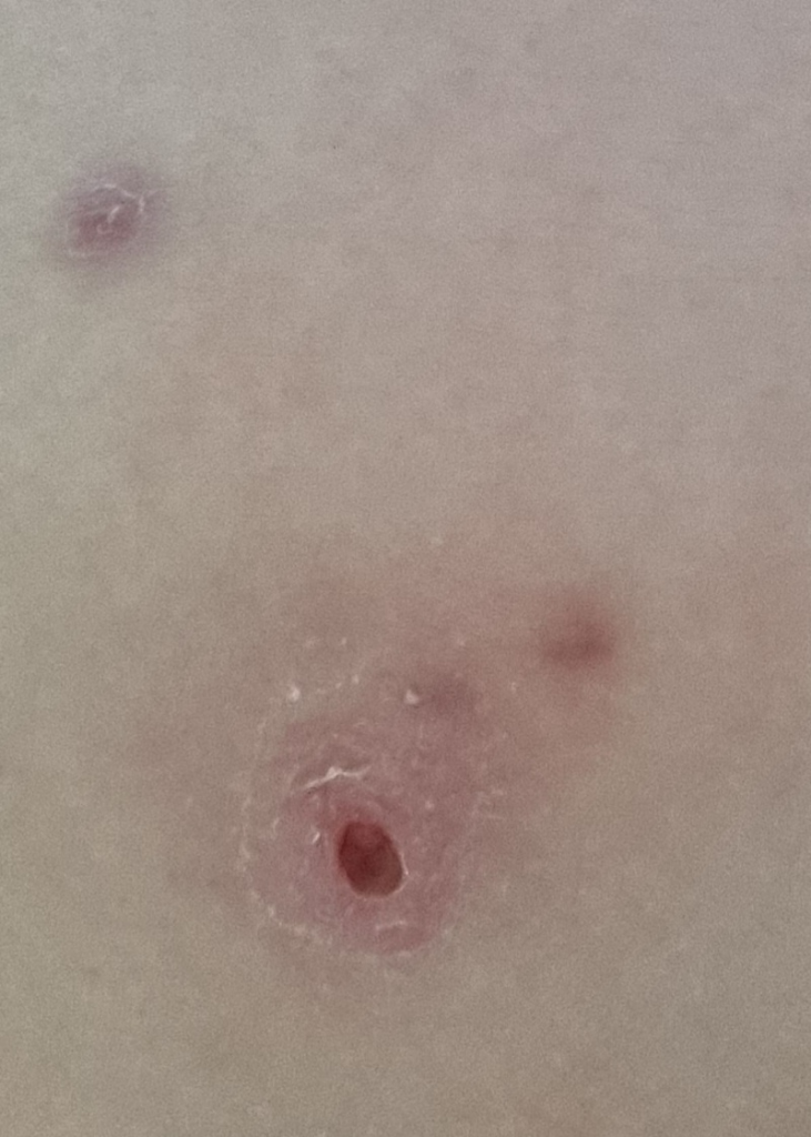 저 사진은 피딱지가 앉았는데도 그 안으로 고름이 계속 차서 그거 짜내다가 피딱지 떨어진 모습이에요. 구멍뚤린건 마데카솔 바르니까 잘 아물었어요. 근데 보라색 반점으로 흉터가 ㅜㅜ 남았어요. 작게작게 났던것들도 아직 보라색 흉 남아있어요. 오래된건 옅어진것 같긴해요