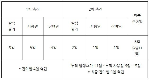 1.9일에 대하여는 3개월이 되기 전 기준으로 10일 이내에, 그 이후에 발생한 2일은 1개월 기준으로 5일 이내에 사용촉진을 진행합니다.