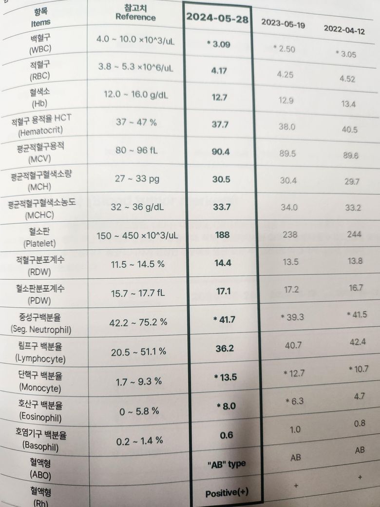 혈소판이나 빈혈 수치는 정상입니다.