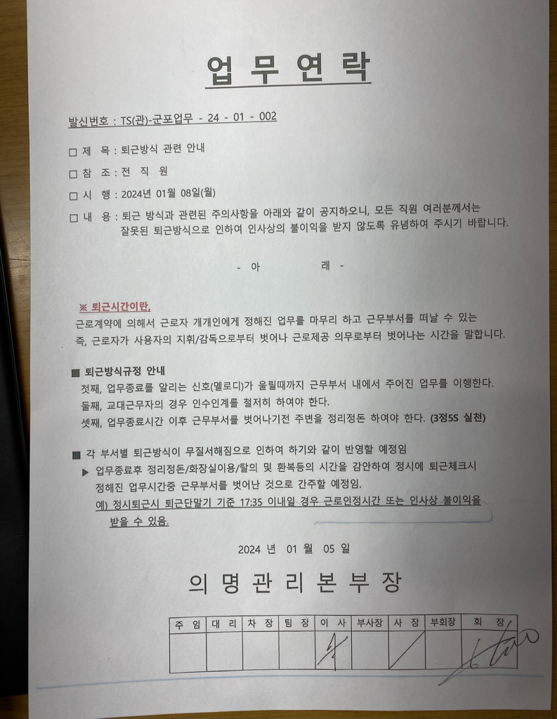 사진 속 내용을 잘 보면 업무종료 후 정리정돈 화장실이용 환복 등의 시간을 고려하여 35분 이전에 퇴근기록이 남으면 근로인정시간 및 인사상 불이익을 주겠다는 내용이 적혀 있습니다.