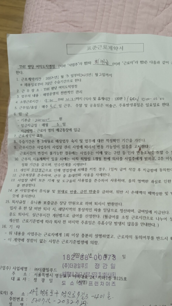2. (54시간+주휴 8시간+연장 14시간×0.5)×4.345주×9,620원= 2,884,124원(세전)
