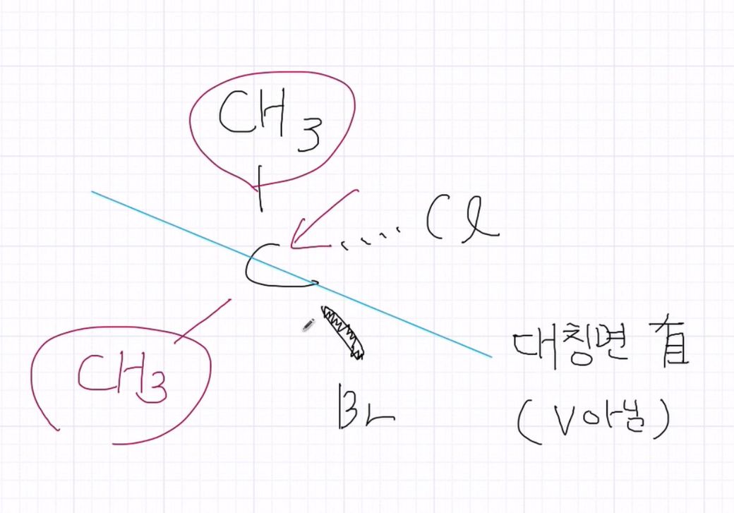 그림에서 CH₃ (메틸) 그룹이 두 개 있고, 하나는 브롬(Br), 다른 하나는 클로린(Cl)과 연결되어 있습니다. 이러한 분자 구조는 실제로 대칭면을 가지고 있을 수 있습니다.