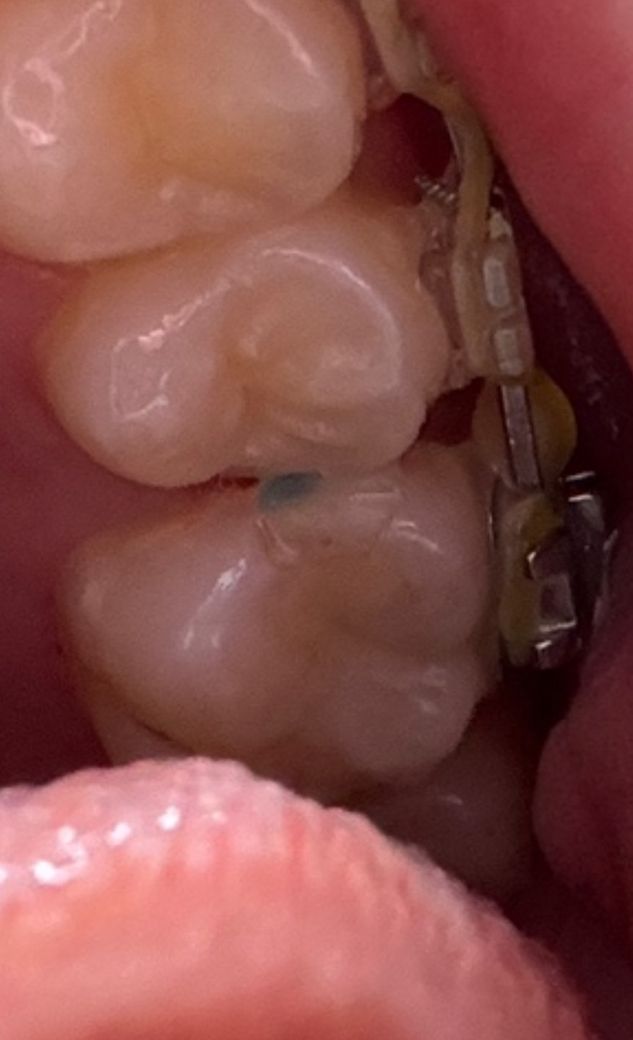 교정을 하시는중이신거 같습니다. 치아 사이 공간을 확보하려고 일부러 해놓은거 같습니다. 충치는 아니니 걱정하지 않으셔도 될것같습니다.