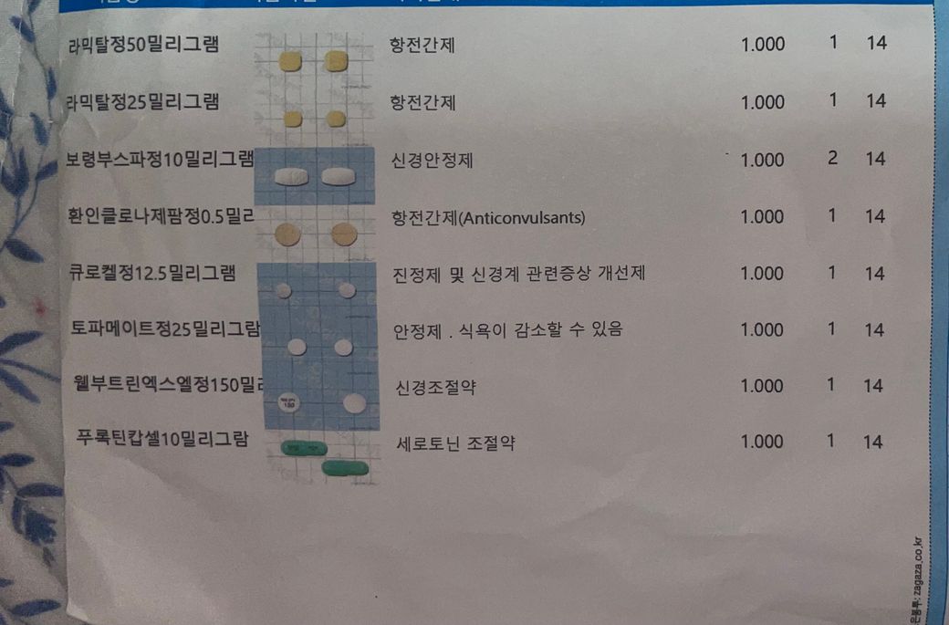 아무 생각 없이 병원에 다니고 있었는데 너무 많이 먹고있는것같기도 하고 선생님께서 잘 신경써주시는건지 의문이 들기도 해서 다른 의사선생님이 보시기엔 약이 어때보이는지 궁금합니다.아침에는 세로토닌,보령부스파,웰부스트린 먹고 저녁에는 토파메이트?먹고 나머지는 자기전에먹습니다