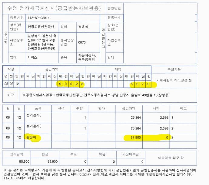 이번에 회사 차량 정기검사를 진행하고 세금계산서를 발행받았습니다.