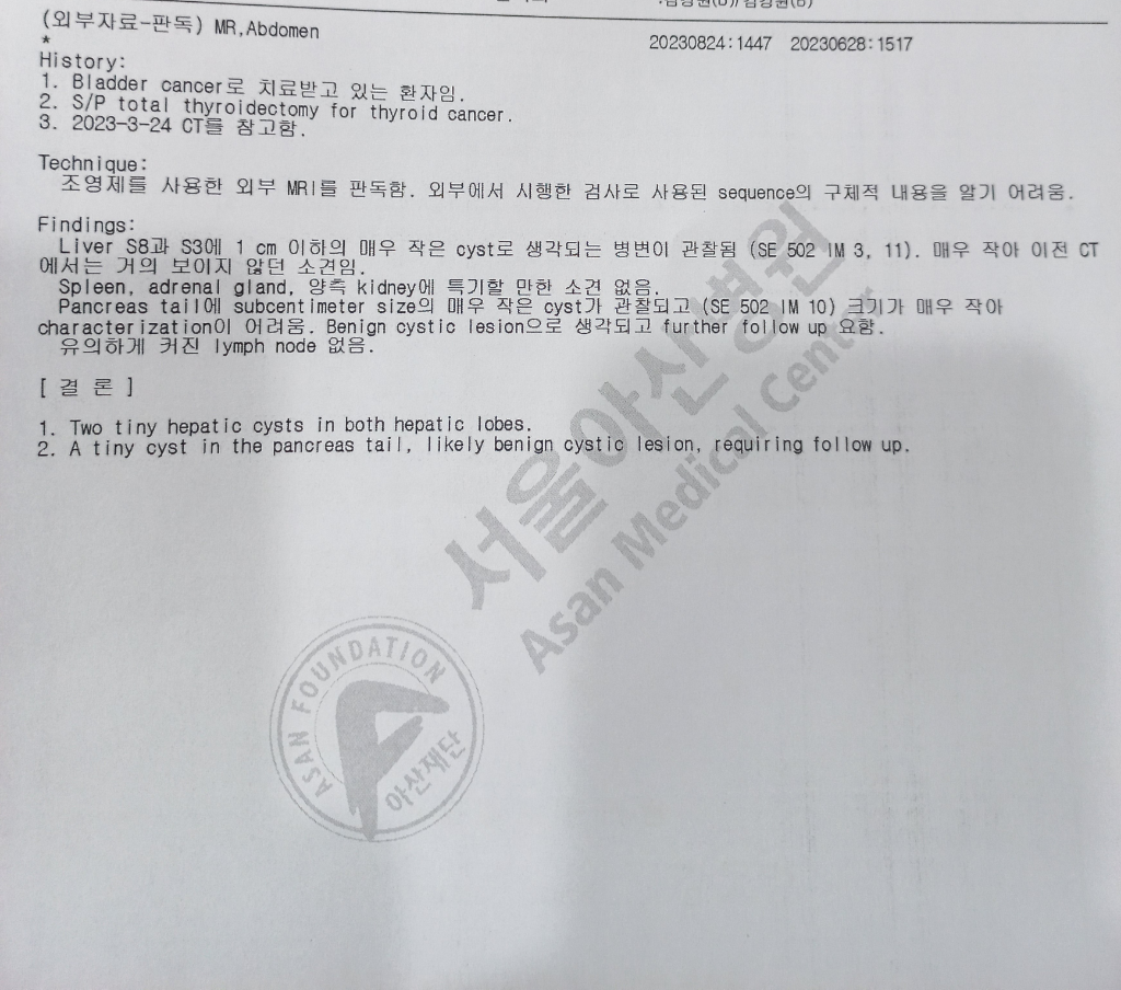 간 MRI 검사에 대해 걱정스러우시군요. 간과 췌장 꼬리부분에 낭종(물혹)이 발견되었고 양성으로 보이니 추적검사만 해보라는 결론입니다.
