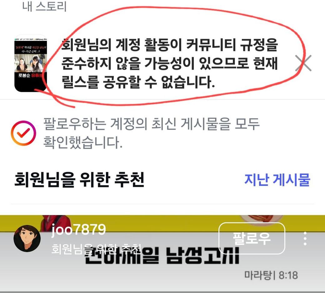 업로드하려는 릴스가 인스타그램 커뮤니티 가이드라인을 위반하는지 확인.