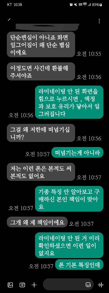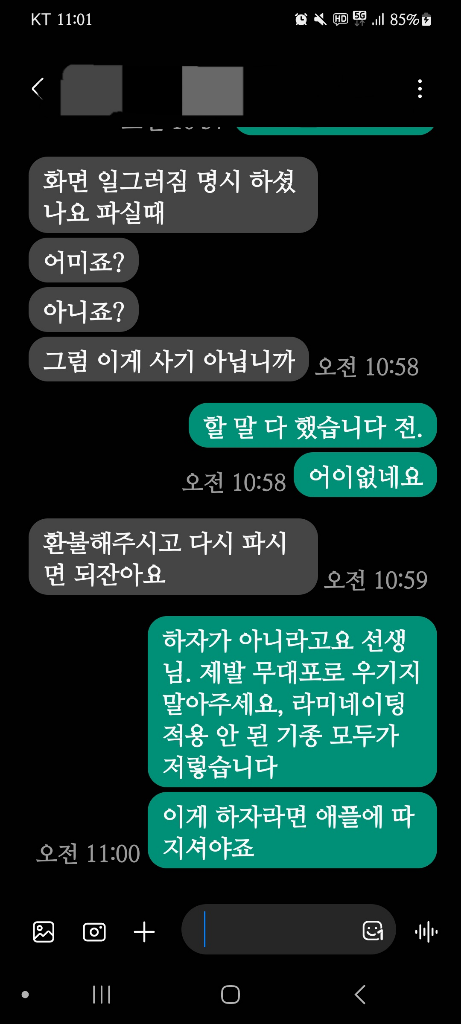 스샷을 보시면 아시다싶이 휴대폰의 액정 및 배터리는 사설 서비스센터에서 교체했다고 명시했고,해당 어플 개인채팅에서도 상세 정보를 원하시길래 휴대폰 설정의 스크린샷을 직접 보내드렸습니다.