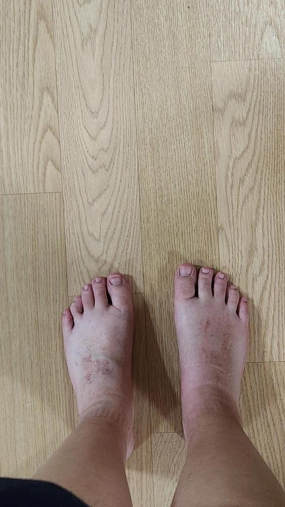 이 사진을 보시면 두 발의 차이가 있는데요 한쪽이 엄청 부었어요ㅜㅜ 아까 아파서 파스 붙이고 땠는데 저렇게 됬는데요 발등이 아파서 그렇게 된걸까요ㅠㅜ 한 며칠전부터 계속 아팠는데 ㅜㅜ 무슨 증상일까요??