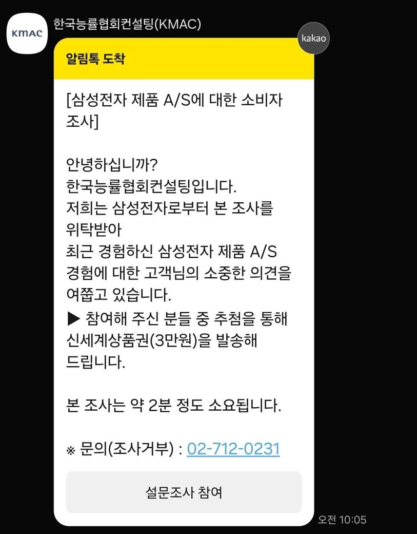삼성서비스센터에서 정상적으로 보내는 카톡이니 걱정하지 않으셔도 됩니다