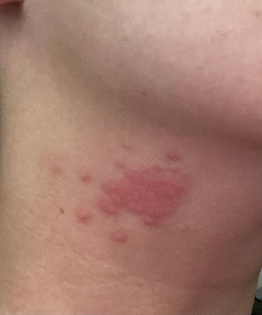 현재 발적이 주로 관찰되고 있으나 군집성 수포와 같은 양상도 감별이 필요해 보입니다. 수포가 발생하고 통증이 있다면 대상포진의 가능성이 있으니 내원하시어 진료를 받아보시는 것이 좋겠습니다.