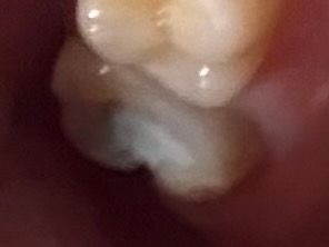 아직 신경치료를 하고나 단단한 재료로 안쪽을 채운게 아니라 임시재료를 넣어 놓은 상태 같습니다. 크라운 치료를 하게되면 다시 치아색나는 재료로 채우고 크라운 치료를 할꺼에요.