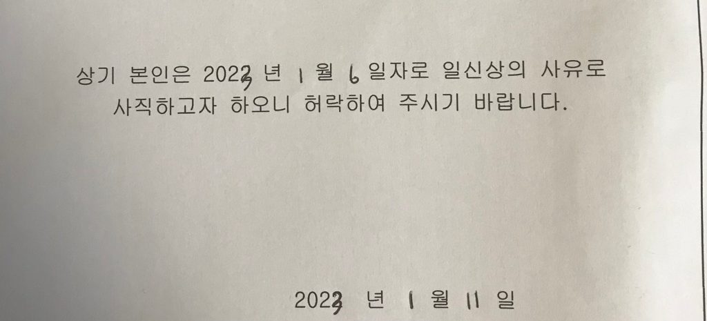 당시 제가 작성하여 제출한 사직서의 일부분 입니다.