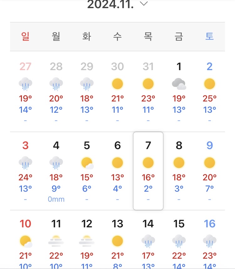 사진은 2024년 11월 서울 날씨인데 이번주까지는 작년이랑 비슷한 수준입니다. 근데 다음주 서울 최저기온이 영하로 내려간다고 하니 다음주부터는 올해가 더 낮은 온도라고 보시면 됩니다.