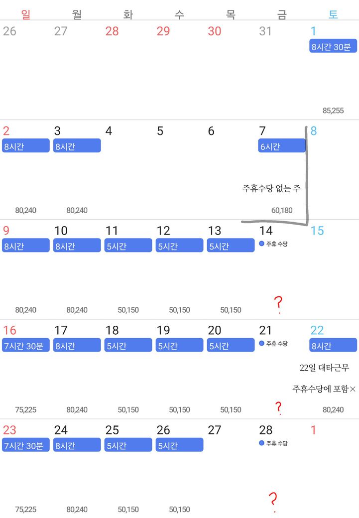 4. 22일~28일: 33.5시간, 주휴수당?(8시간은 대타로 근무해줘서 적용×, 하루는 새 근로자 교육을 위해 나오지 말라고 함(5시간 근무일))